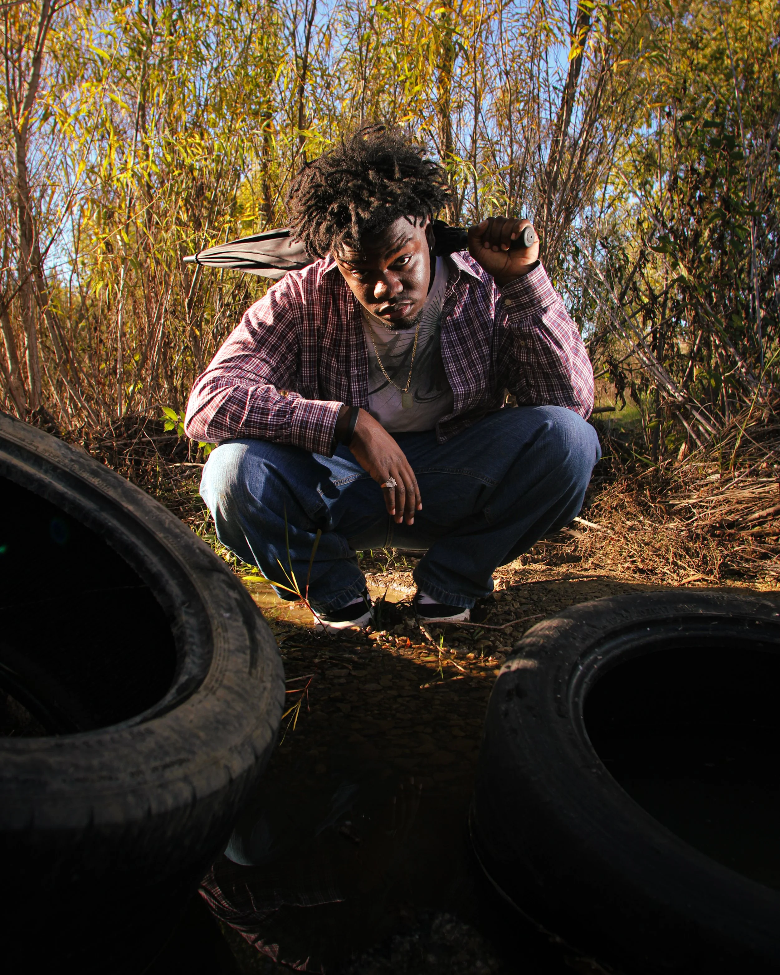 A young man crouches near a small body of water in a grassy, wooded area, holding a knife over his shoulder with two old tires in the foreground.