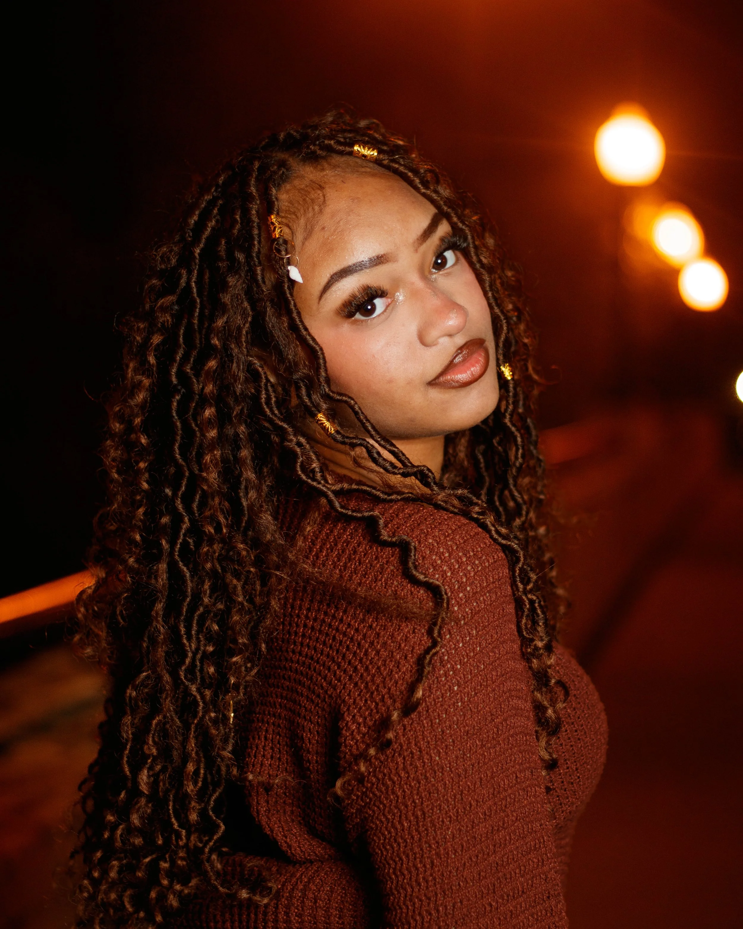 A young woman with curly hair and makeup, wearing a red knit sweater, looking at the camera in a dimly lit setting with warm lights in the background.