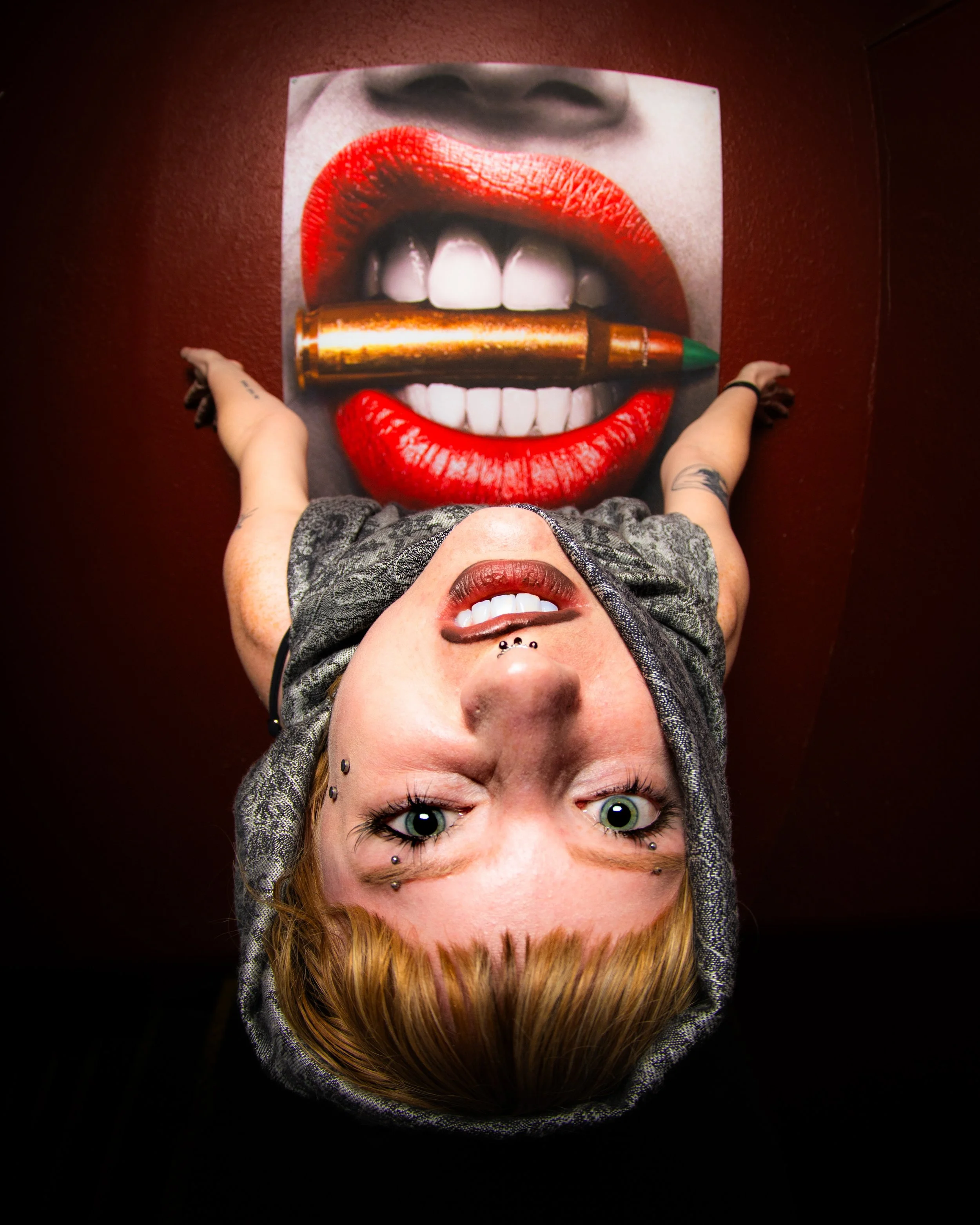 Person with blonde hair and facial piercings lying on side, smiling, positioned below a large poster of lips with red lipstick, teeth, and a lipstick shaped object in mouth, on a red background. View fullsize