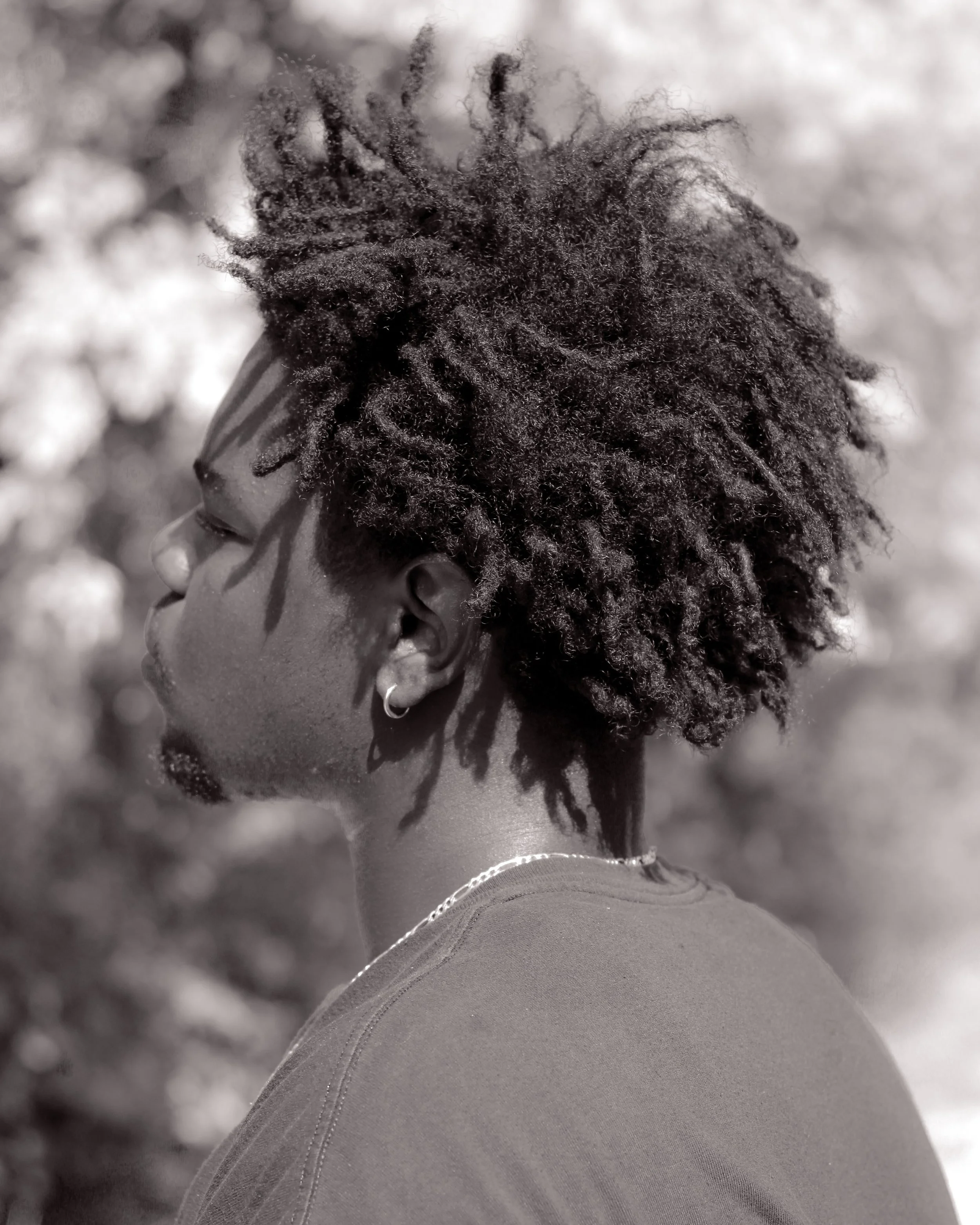 Black man with natural textured hair in profile, wearing an earring and a chain necklace, outdoors with blurred background. View fullsize