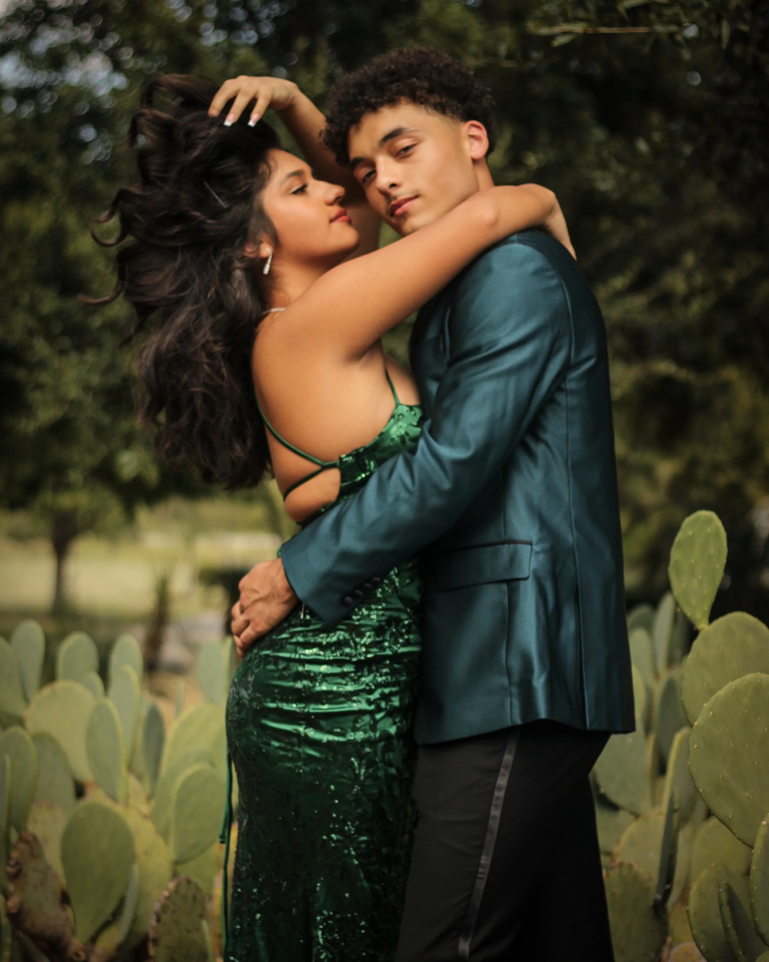 A young couple dressed up, embracing each other outdoors in front of green plants and cacti, smiling peacefully.