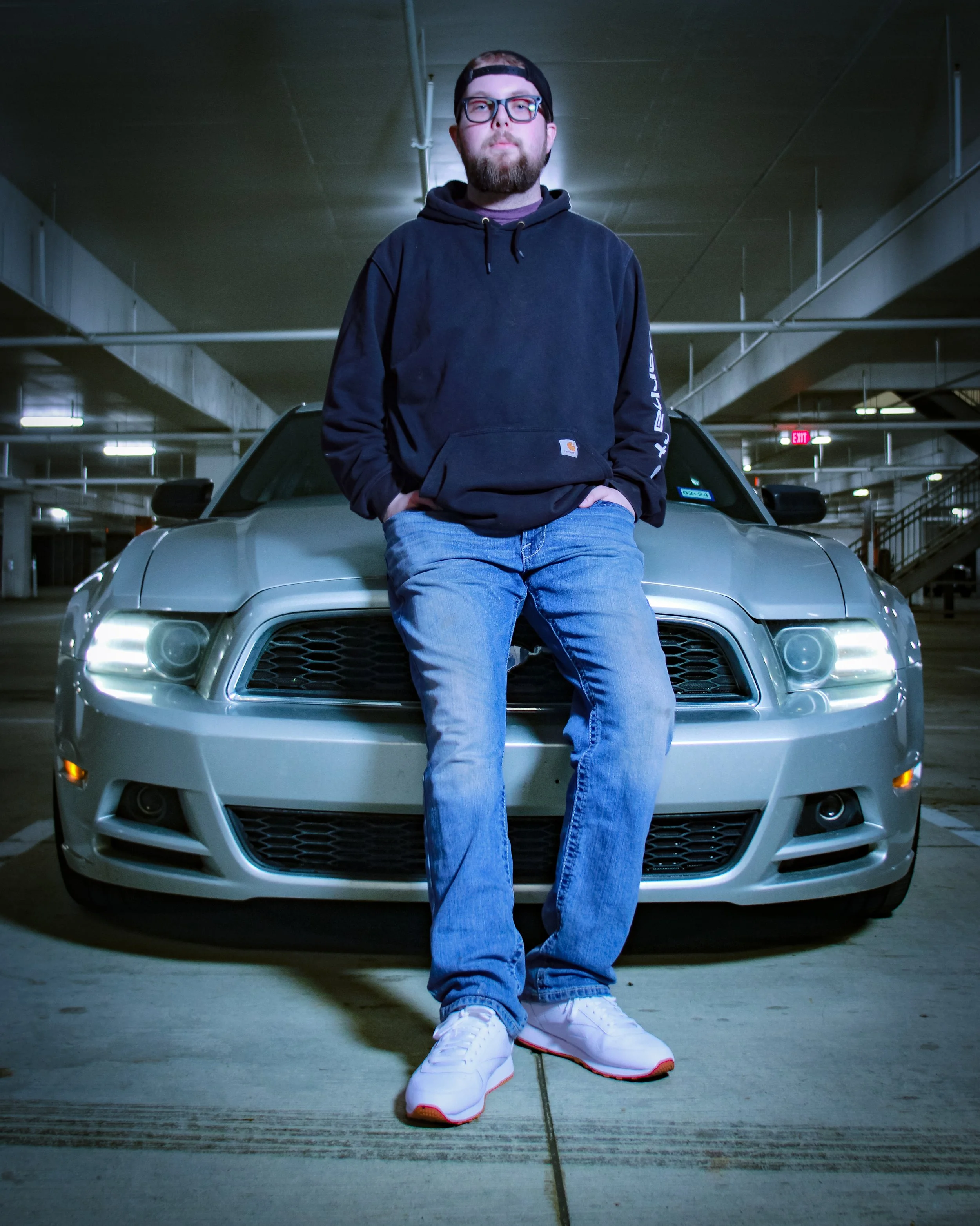 A young man with glasses, beard, and a backward cap is sitting on the front of a silver car in an underground parking garage.