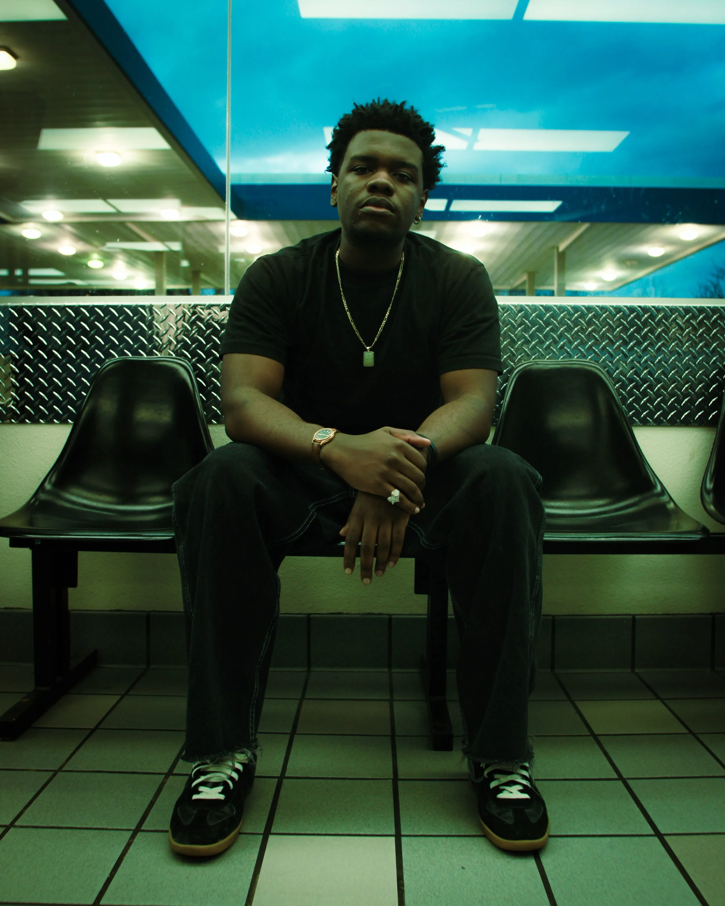 Man sitting alone on black plastic chairs at an airport or bus station, with a large glass window behind him showing a sky and interior overhead lights.
